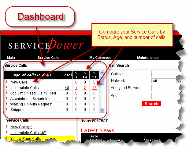 The Service Calls Dashboard, near the top left of the main page, is one of the most used features of the SERVICEPower site.